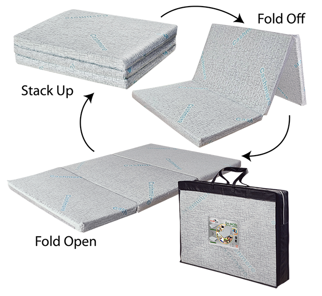 LA-MORI Tri-fold Mattress can be folded away for easy storage, and it is also an alternative bed for guest. You also can use for baby napping, kids playpen, living lifestyle, yoga, outdoor picnic, hostel or temporary use.
